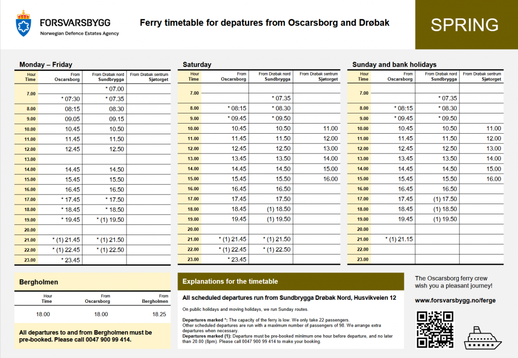 The second option is traveling to Drobak and taking a ferry to Oscarsborg. Drobak is about 35 miles south of Oslo and about a 40 min bus ride with a few minutes of walking. The ferry from Drobak to Oscarsborg take approximately 5 minutes. Information for the Drobak to Oscarsborg ferry can be found on https://www.forsvarsbygg.no/en/festningene/oscarsborg-fortress/oscarsborg-ferry. The ferry timetable is pictured on the right and also available on the provided website.